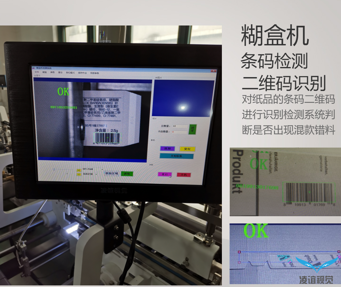 通常包裝廠生產(chǎn)的紙盒產(chǎn)品在出廠交貨前一道工序為粘盒,凌誼視覺提供的糊盒機防混貨檢測系統(tǒng)是加裝在糊盒機臺上實現(xiàn)在線檢測,防止粘盒混貨,識別條碼防呆,保障產(chǎn)品出貨品質(zhì)。該粘盒防混貨檢測系統(tǒng)基于CCD機器視覺識別技術(shù),采用高速進口工業(yè)相機設備,通過高速反應的光電感應觸發(fā),對每一個包裝盒子上的圖文、條碼、料號信息識別實時傳輸給由我公司自主研發(fā)的凌誼視覺檢測系統(tǒng),由視覺檢測系統(tǒng)進行數(shù)據(jù)對比校驗后判斷是否存在混貨串貨的情況,當檢測到混貨產(chǎn)品時,系統(tǒng)實時進行聲光報警同時由停機模塊輸出停機信號控制糊盒機停機,把混貨產(chǎn)品停在相對固定的位置,方便查找和取出。